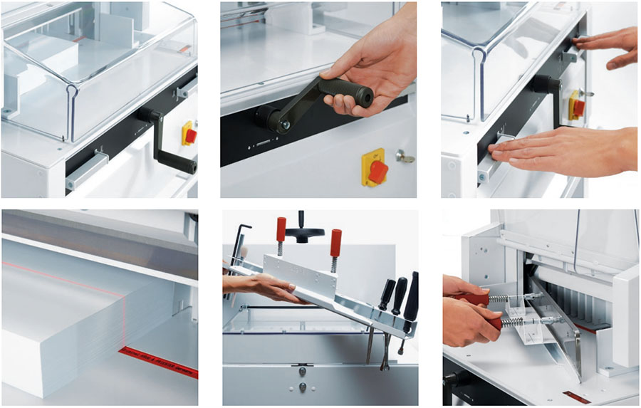Операция реза в Ideal 4815 осуществляется электромеханическим приводом, активация которого происходит двумя руками, что минимизирует риск возникновения производственной травмы. Рабочая зона во время осуществления реза закрывается прозрачным кожухом, при открытии которого лезвие блокируется.