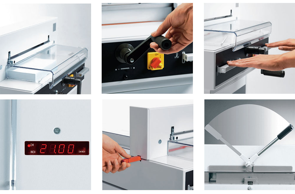 Удобная электрическая гильотина с ручным прижимом, с длиной реза до 430 мм и 435 мм глубиной стола (для форматов до А3)